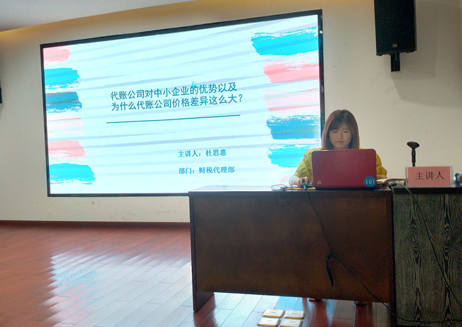杜思惠轉正時間不長,但她工作努力、學習認真,已經成為部門經理的得力助手。當日,她結合日常學習到的點滴,以權敢勞務公司財稅代理簽約入題,從注冊公司找代理記賬公司代辦的好處,代理記賬公司對中小企業(yè)的優(yōu)勢,代記賬公司的價格差異為什么這么大等三個方面展開闡述,使參訓人員受益良多。中心副主任汪銘進行了點評,他肯定了杜思惠的選題和內容組織,號召大家善于從日常工作、學習中積累素材,為PPT分享做好準備,不斷提升中心的對外服務水平。