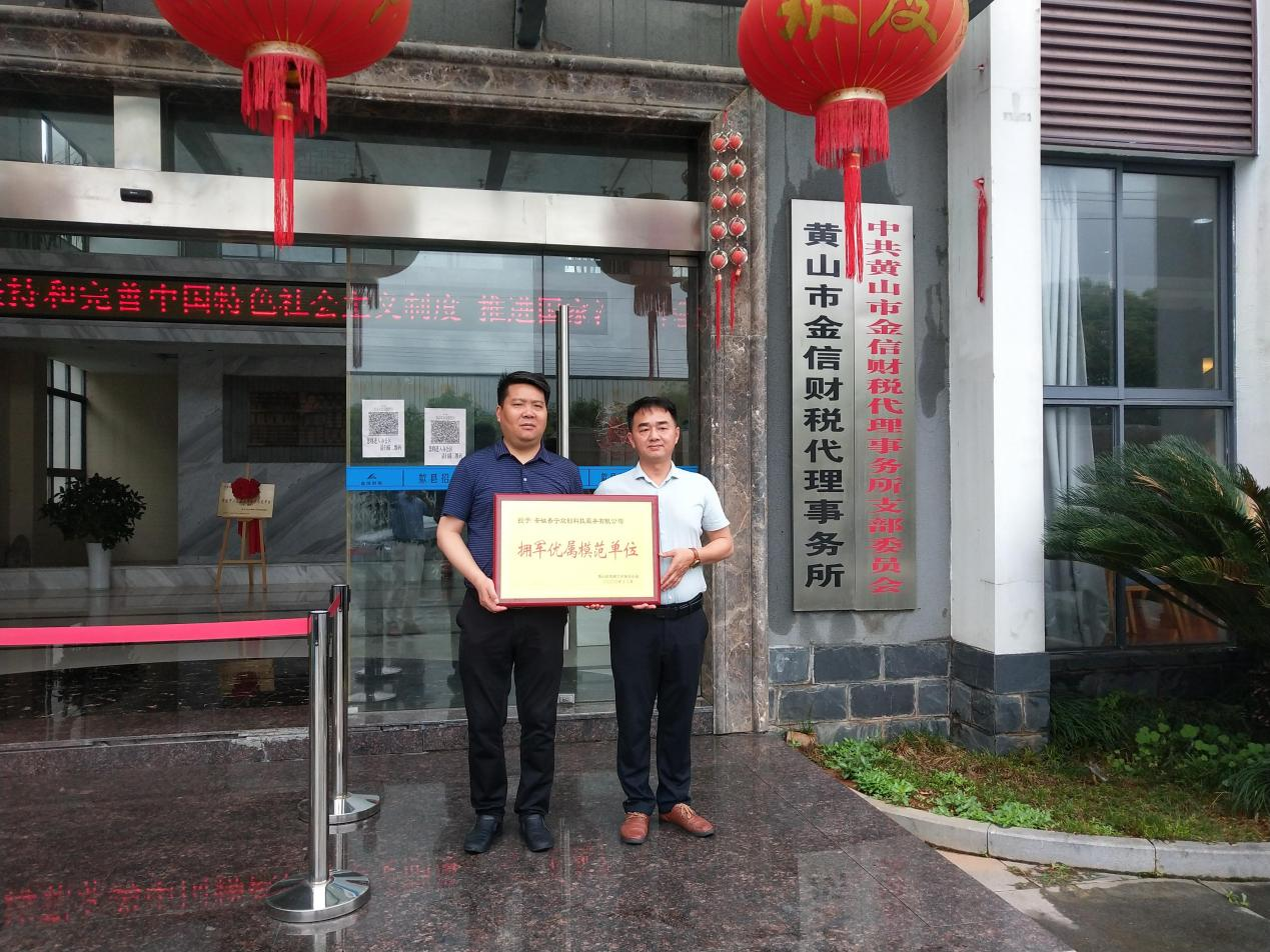 2021年5月11日,歙縣退役軍人事務(wù)局洪四如局長(zhǎng)專程來到我公司,代表黃山市雙擁工作領(lǐng)導(dǎo)組頒發(fā)全市“擁軍優(yōu)屬模范單位”牌匾。公司總經(jīng)理胡海鋒、綜合部經(jīng)理方志義接受牌匾。