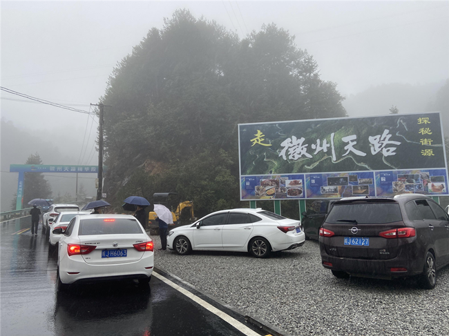 上午10點(diǎn),抵達(dá)徽州天路海拔最高處的大峰尖山頂,天路名不虛傳,加之細(xì)雨綿綿,呈現(xiàn)出云霧繚繞,樹(shù)木、山峰若隱若現(xiàn)的情景,宛如瓊瑤仙境,員工們都不由得拿出手機(jī),記錄沿途的神奇、美麗的風(fēng)景。