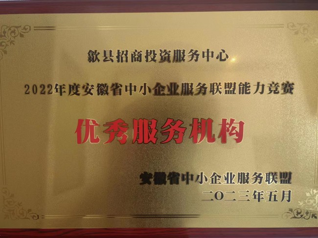2023年5月23日,2022年度安徽省中小企業(yè)服務(wù)聯(lián)盟能力競(jìng)賽暨中小企業(yè)服務(wù)優(yōu)秀案例評(píng)選頒獎(jiǎng)儀式在合肥舉辦。歙縣招商投資服務(wù)中心在此次活動(dòng)中被評(píng)為“優(yōu)秀服務(wù)機(jī)構(gòu)”,全省僅有十家單位獲得此項(xiàng)榮譽(yù)。中心負(fù)責(zé)人胡海鋒參加儀式并上臺(tái)接受獎(jiǎng)牌。